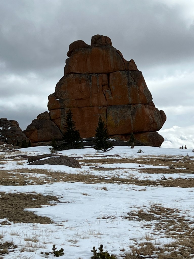 The next mile was not quite as steep, but had 1.5-2′ of packed snow. Once you emerge above treeline, another world of large and unusual rock formations reveals itself. It reminds me of the land of the giants that Jack discovers after climbing the beanstalk. I imagined that giants were playing hide and seek behind the rocks.