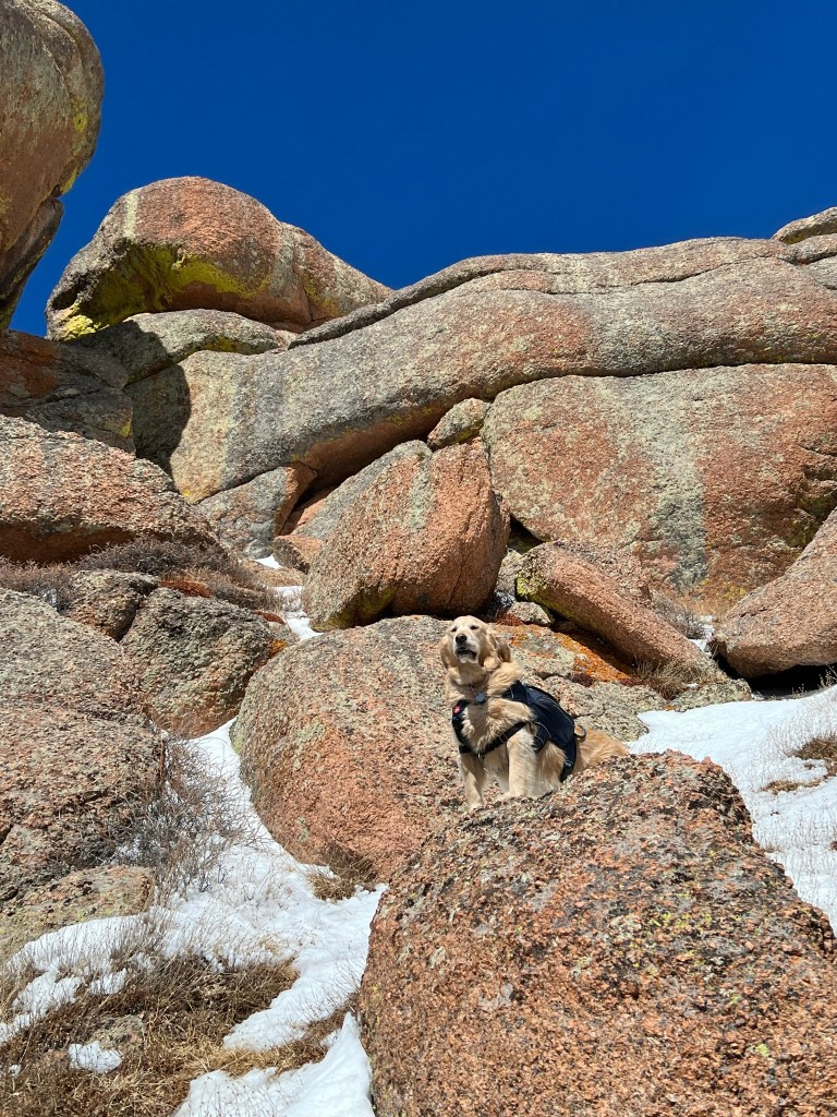 After a 2 hour drive, Maizy and I bounded from the car. The hike from Ute Creek Trailhead starts gently, in the wide valley of the still-frozen Tarryall Creek. After a mile, the trail turns North as it hits Ute Creek. The creek was flowing and all babbly and charming. But as quickly as it appeared, it vanished. I was still following the fold in the landscape where the creek should be, but it was now bashfully hiding underground, as creeks in the Lost Creek Wilderness have an odd habit of doing.